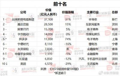 除了腾讯和字节跳动,前十名中还有其他多家知名企业。第十名是以1100亿元的增长率上升至6800亿元的企业。此次榜单显示,整体来看,胡润中国500强企业的总价值已达到56万亿元,充分展现了中国非国有企业的庞大规模与潜力。