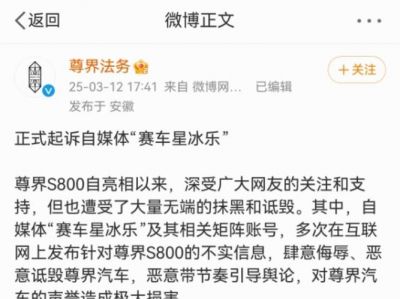 据声明,尊界 S800 自发布以来,得到了消费者和网友的热烈关注与支持,但伴随而来的是大量针对其产品的恶意抹黑和无端攻击。一些自媒体账号,如“赛车星冰乐”,不仅传播虚假信息,还试图通过引导舆论来损害尊界汽车的声誉。尊界汽车指出,这种行为严重影响了其品牌形象及市场表现,并提出了四项诉讼请求:停止侵权、删除不实言论、公开赔礼道歉及经济赔偿。