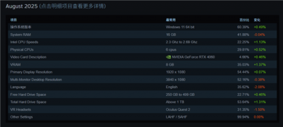 在操作系统方面,Steam的最新统计显示,Windows 10仍然是首选,虽然Windows 11逐渐得到支持和青睐,但其市场占有率仍有待提升。操作系统的优化程度也直接影响了硬件的使用效率,比如在Windows 11中对于内存和显卡的使用优化,使得32GB内存能够发挥更大效用。