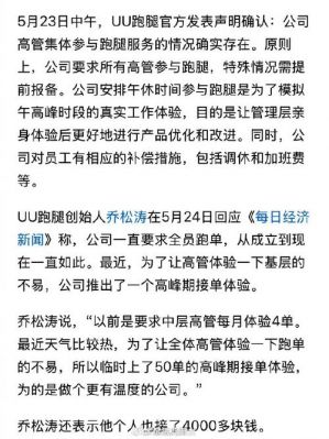 UU跑腿的高管接单事件,虽然起因于促进管理层对基层工作的认识,但为企业管理无形中带来了不少争议与讨论,要求企业在追求业绩与员工健康之间找到更好的平衡。希望在未来,UU跑腿能够真正做到以人为本,在提升企业效率的同时,也保障员工的基本权益与身心健康。